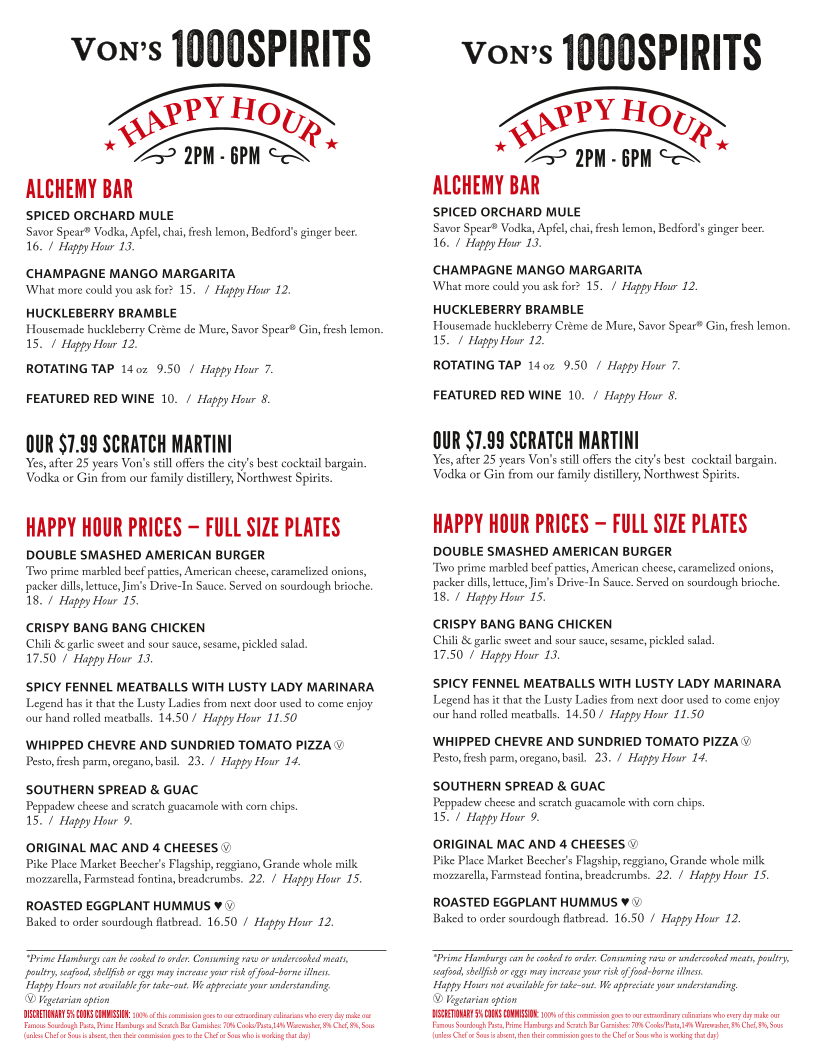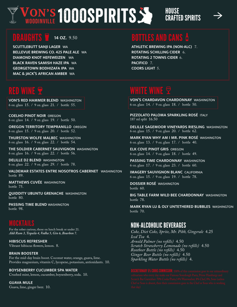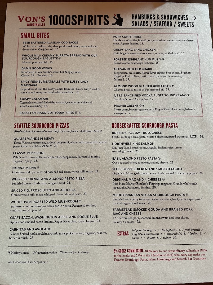 Welcome to Von's 1000 Spirits - Woodinville, a culinary gem tucked away in the heart of Woodinville, WA. Here, you can savor artisanal creations amid an inviting atmosphere that seamlessly blends indoor comfort and outdoor charm. Their menu shines with delightful small bites, like Spicy Fennel Meatballs and Crispy Alaskan Cod Tacos, perfect for sharing or indulging solo.